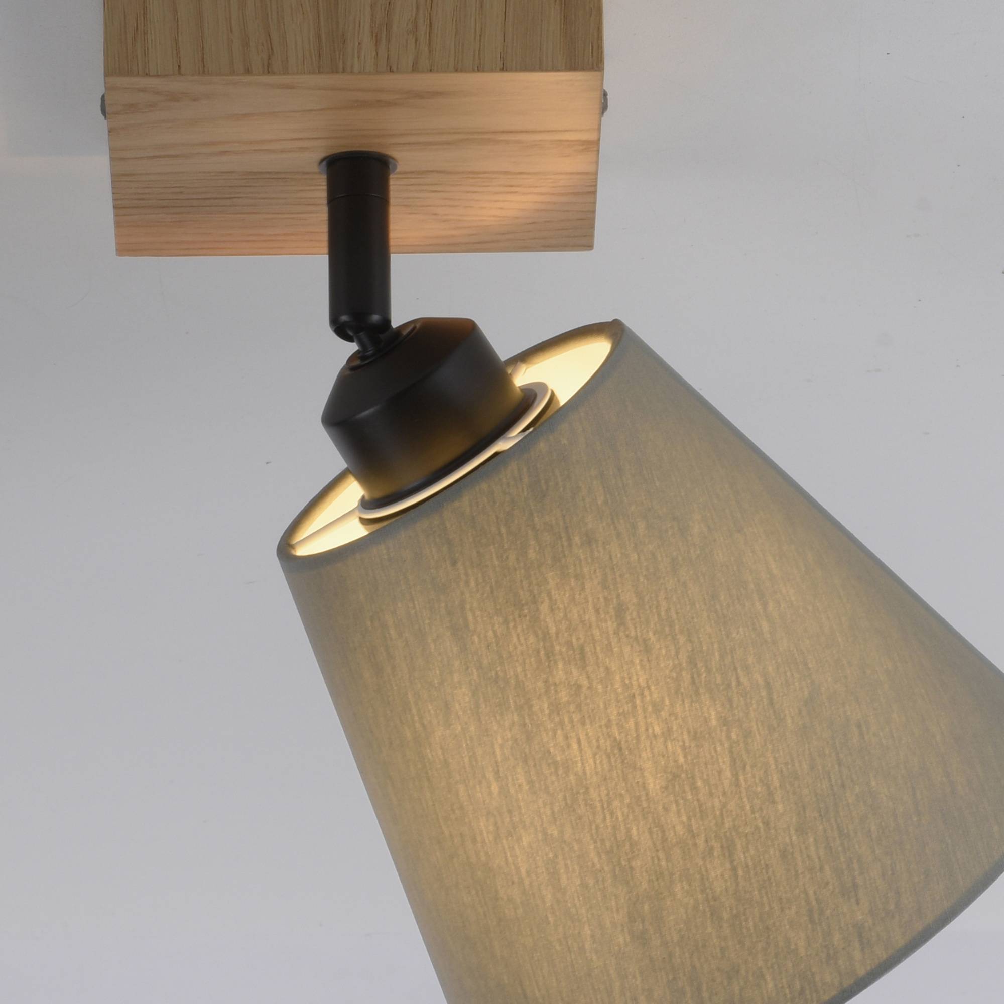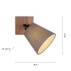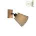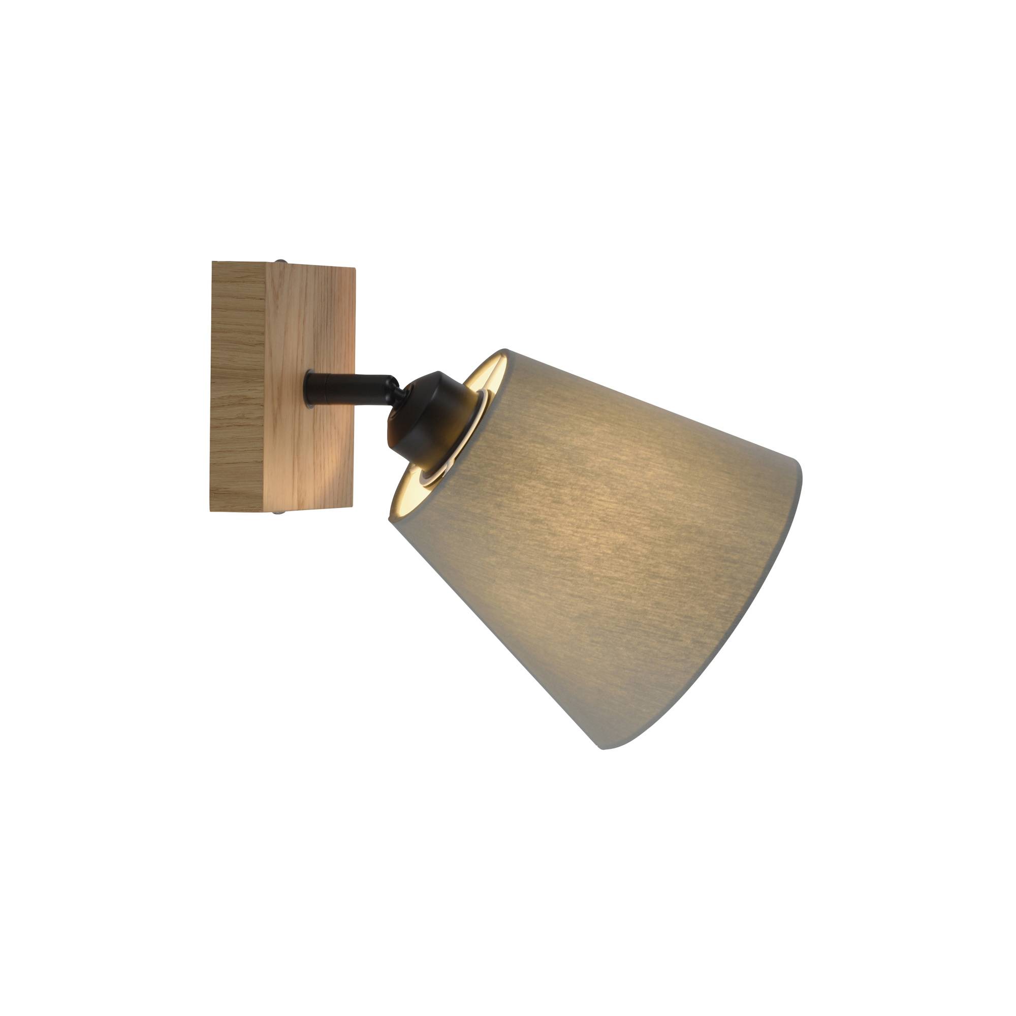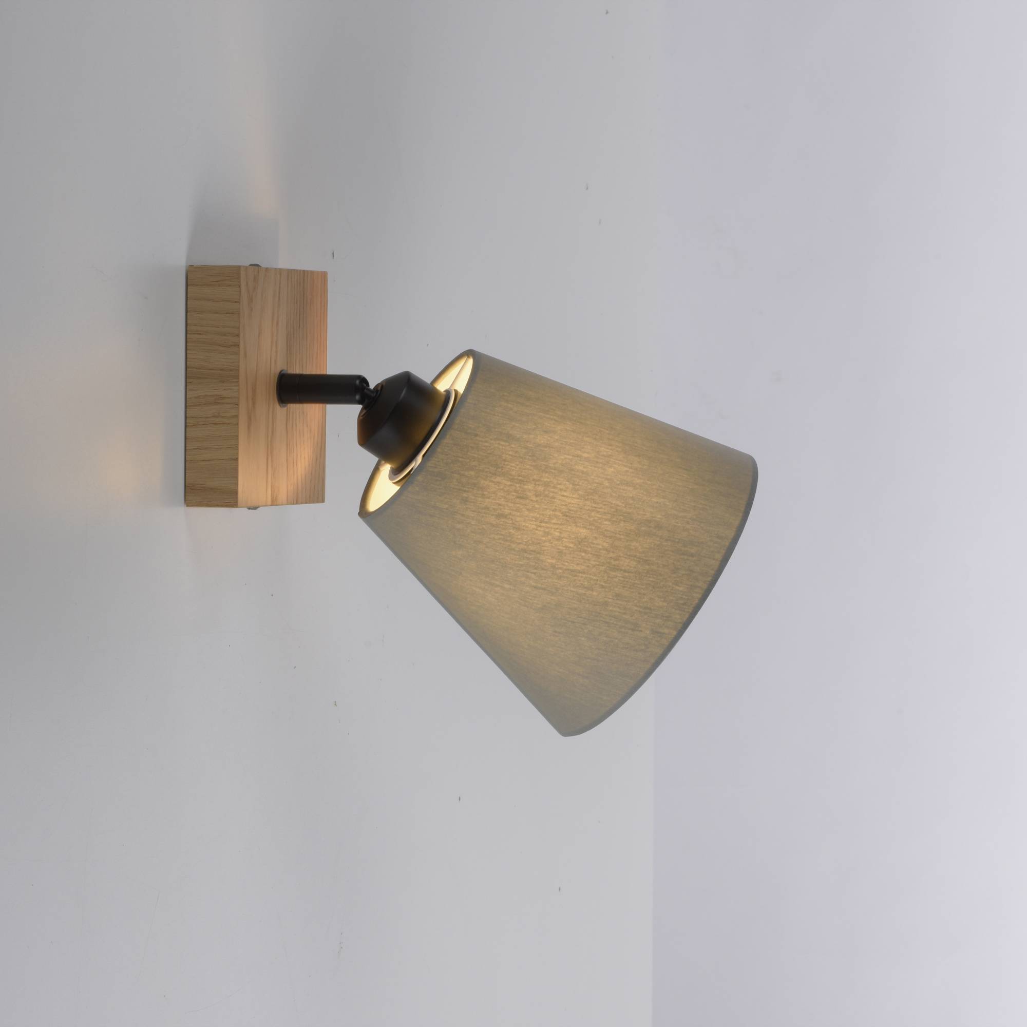 Ramię lampy, w eleganckim, matowo czarnym wykończeniu, subtelnie kontrastuje z drewnianą podstawą, podkreślając nowoczesny charakter całej kompozycji. Klosz o stożkowym kształcie został wykonany z wysokiej jakości tkaniny w jasnym, neutralnym kolorze, który pięknie współgra z naturalnym drewnem. Materiał delikatnie filtruje światło, dzięki czemu kinkiet emituje przyjemną, miękką poświatę sprzyjającą relaksowi.