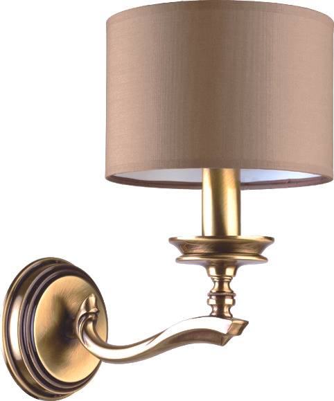 Kinkiet osadzony jest na ozdobnym ramieniu o klasycznie wygiętej linii, które płynnie łączy się z dekoracyjnym trzonem oprawy. Każdy detal został starannie wykonany, a lekko postarzana powierzchnia metalu nadaje lampie szlachetnego charakteru i głębi. Całość wieńczy okrągły stelaż ścienny z eleganckim frezowaniem, który dopełnia projekt i zapewnia stabilne mocowanie.