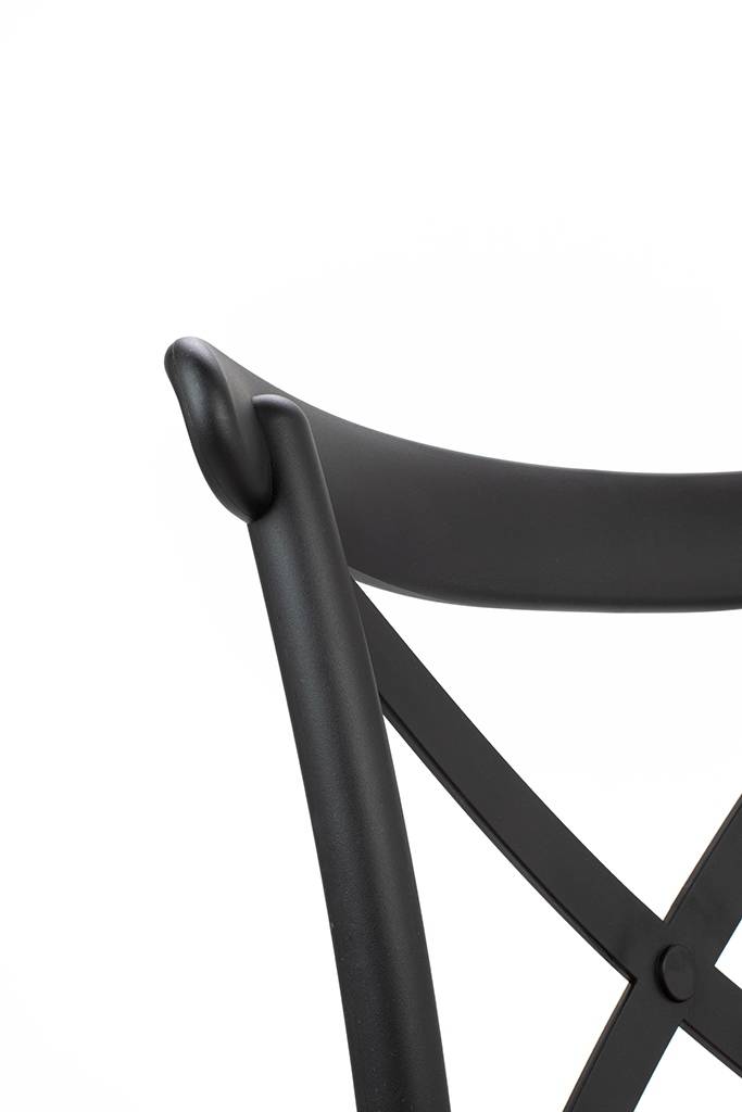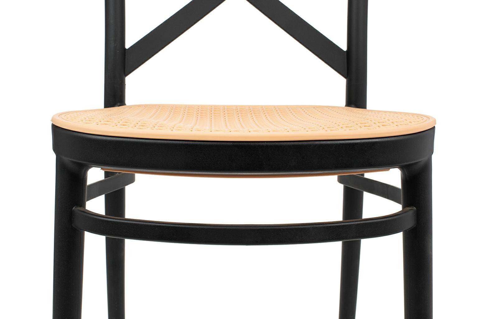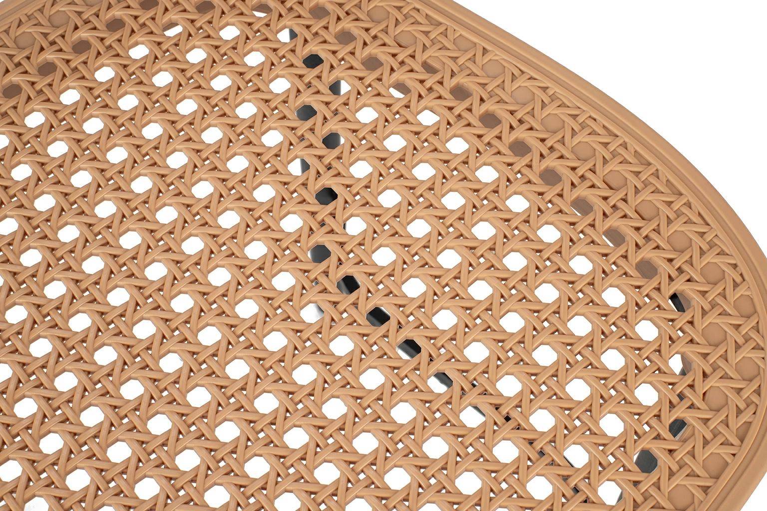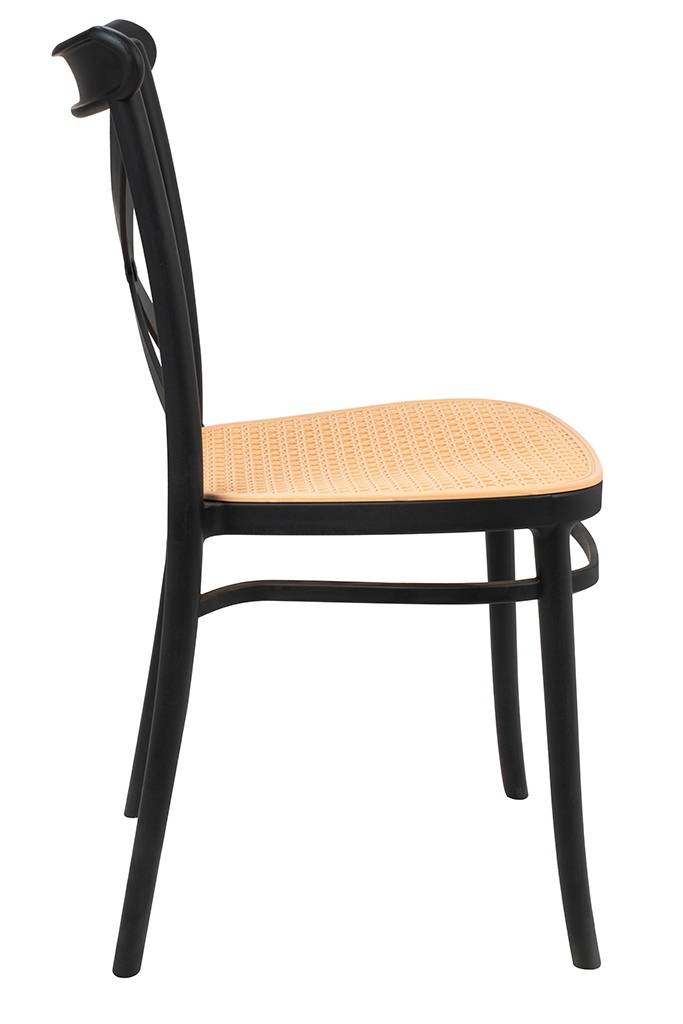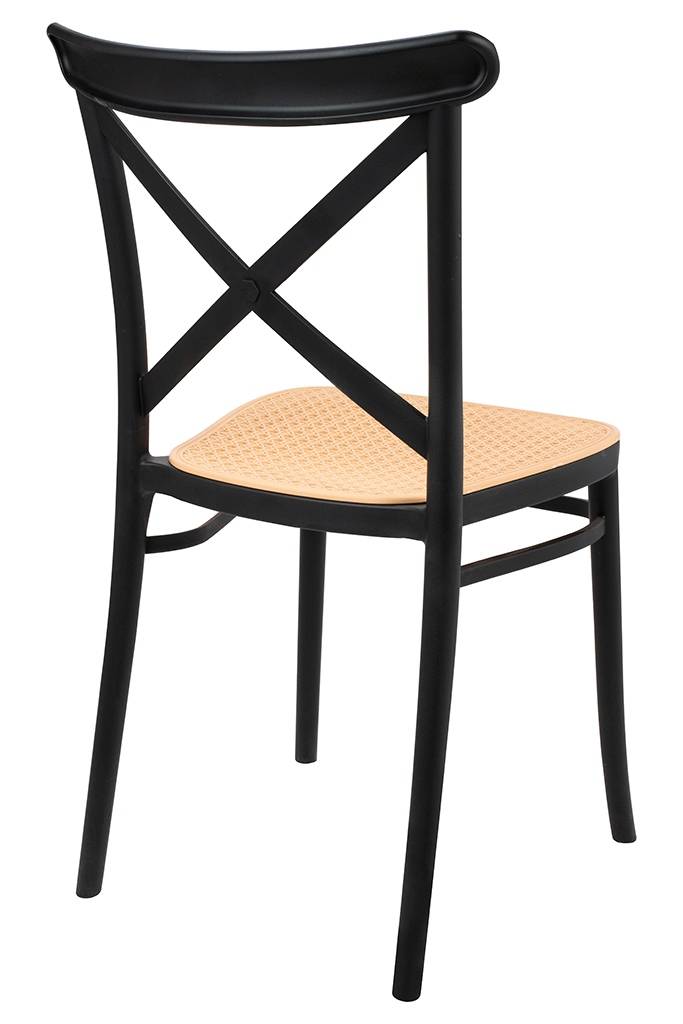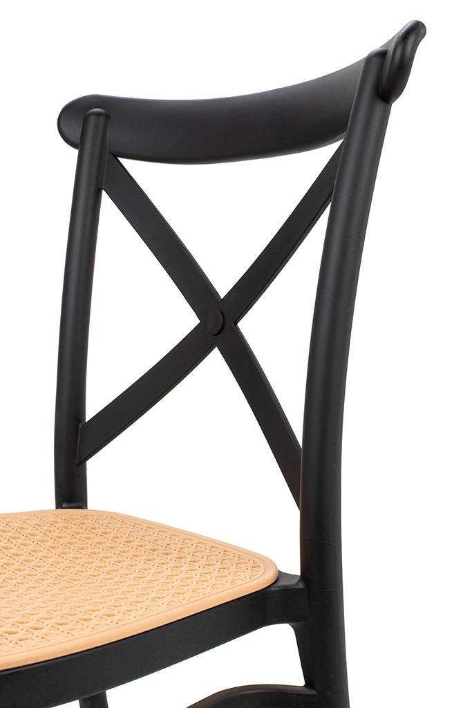 Ażurowe siedzisko przypominające rattan i skrzyżowane oparcie powodują, że krzesło nabiera lekkości.