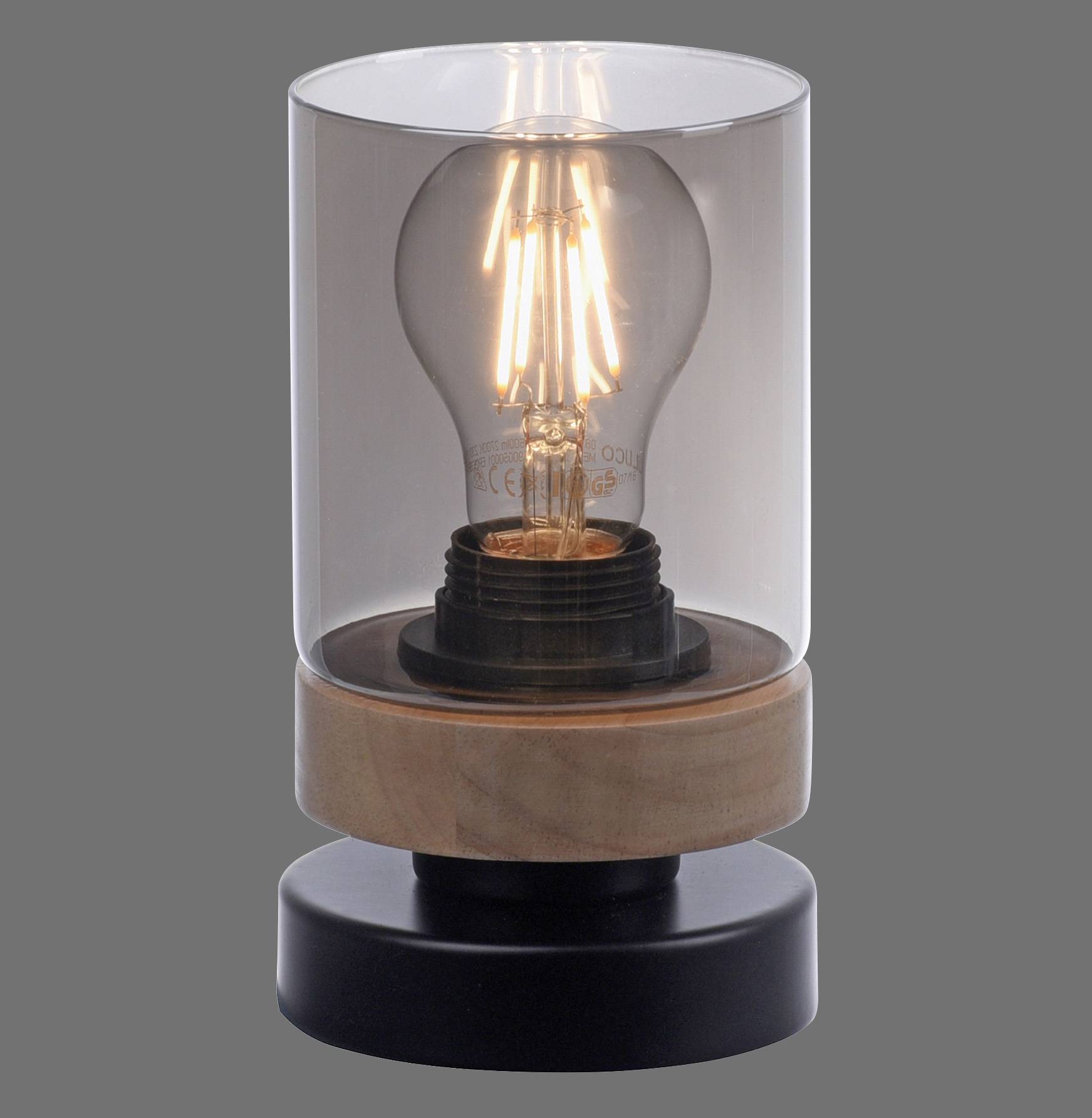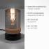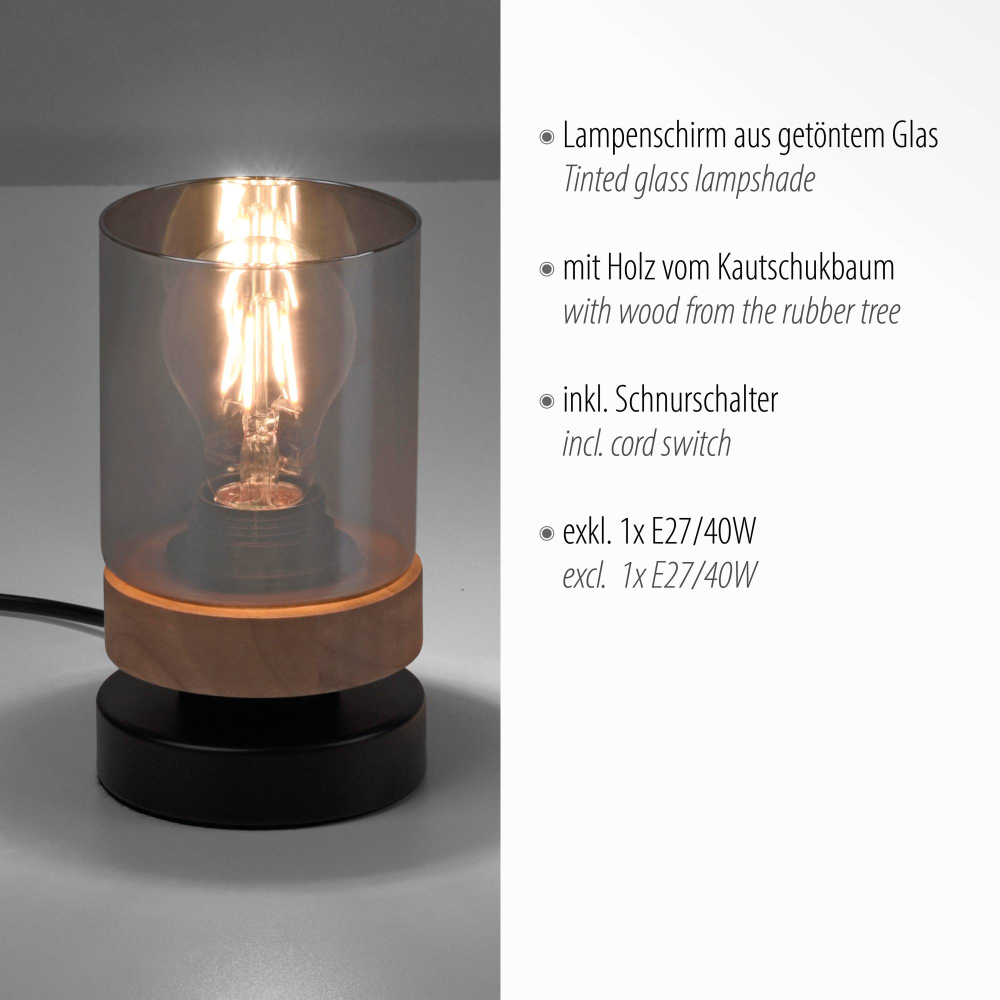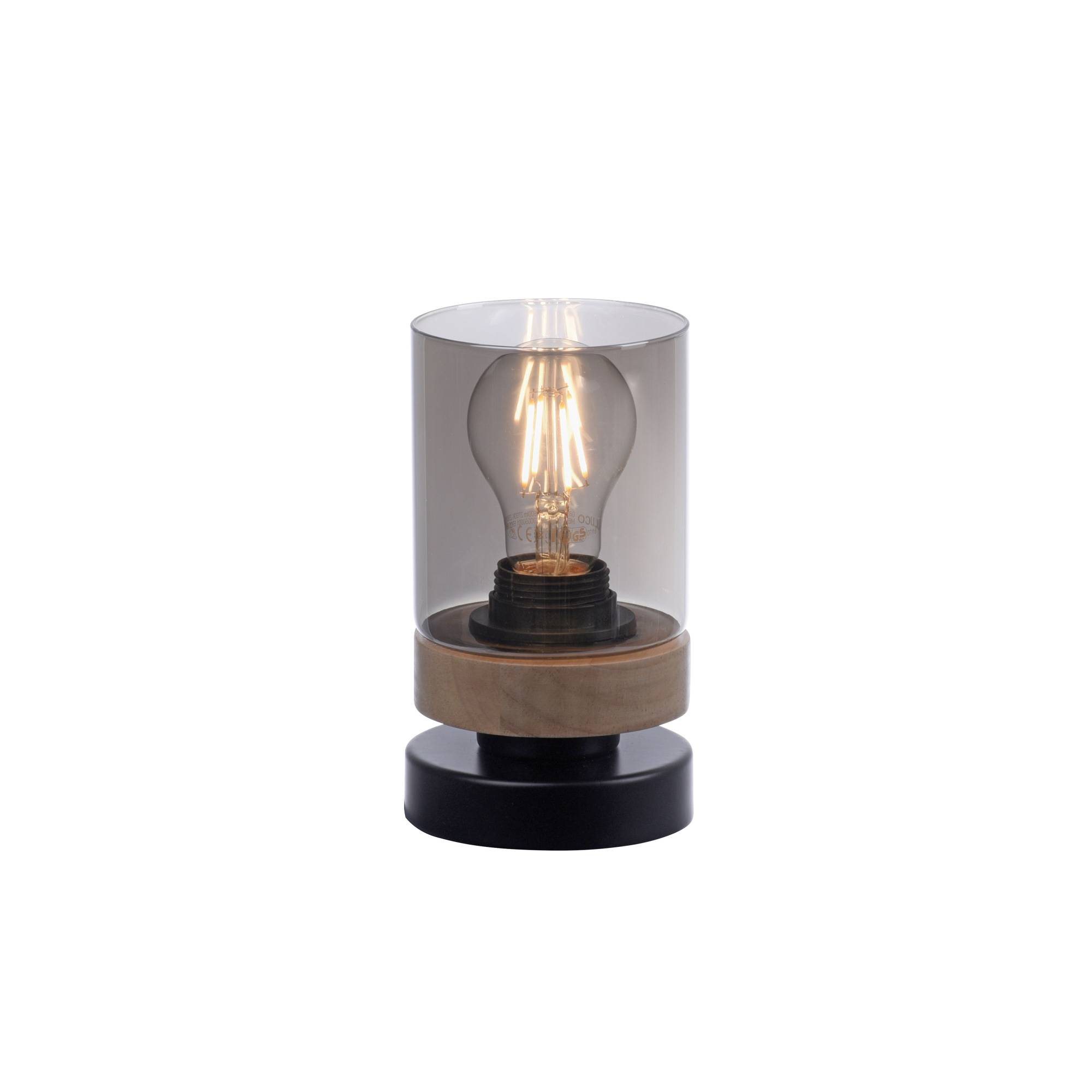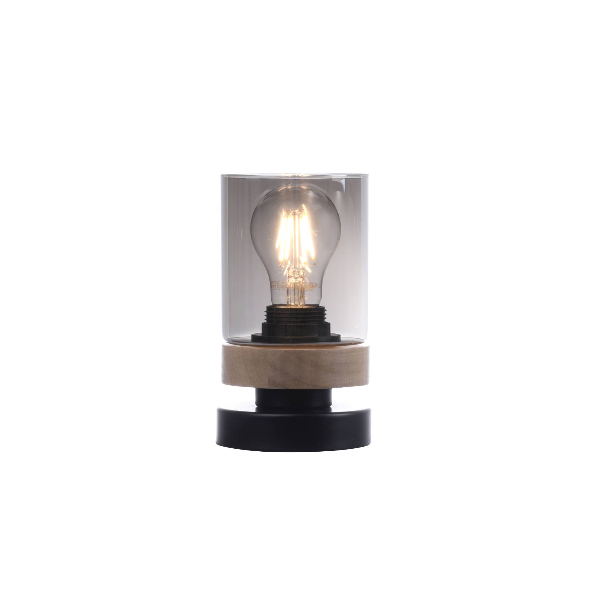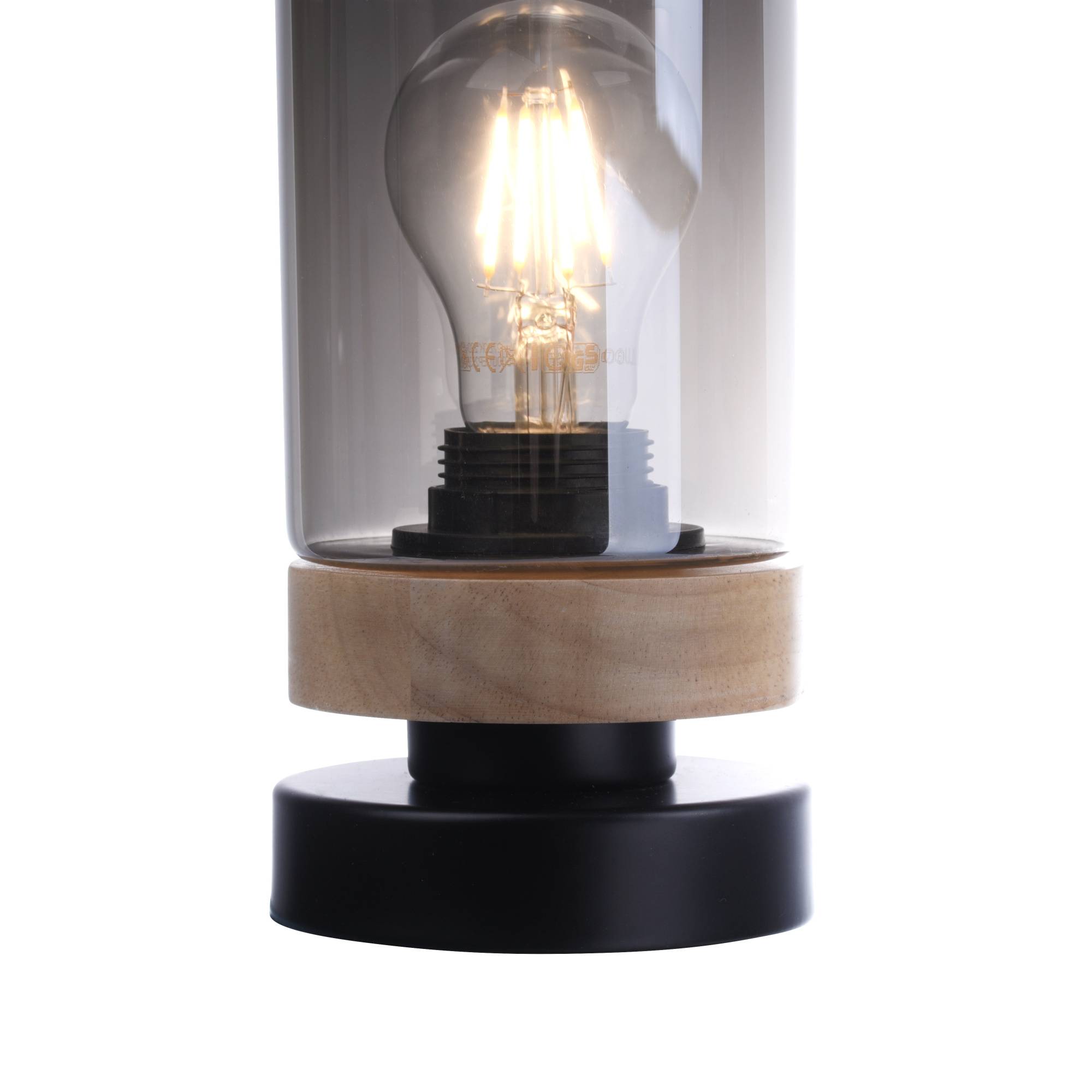 Przezroczysty, cylindryczny klosz subtelnie eksponuje żarówkę, czyniąc z niej centralny element dekoracyjny lampy. Dzięki temu idealnie prezentują się w niej modne źródła światła typu filament, które nadają wnętrzu przytulnego, nastrojowego klimatu. Drewno ociepla całość projektu, dodając mu naturalnego charakteru i lekkości, natomiast czarna podstawa wprowadza kontrast oraz stabilność wizualną.