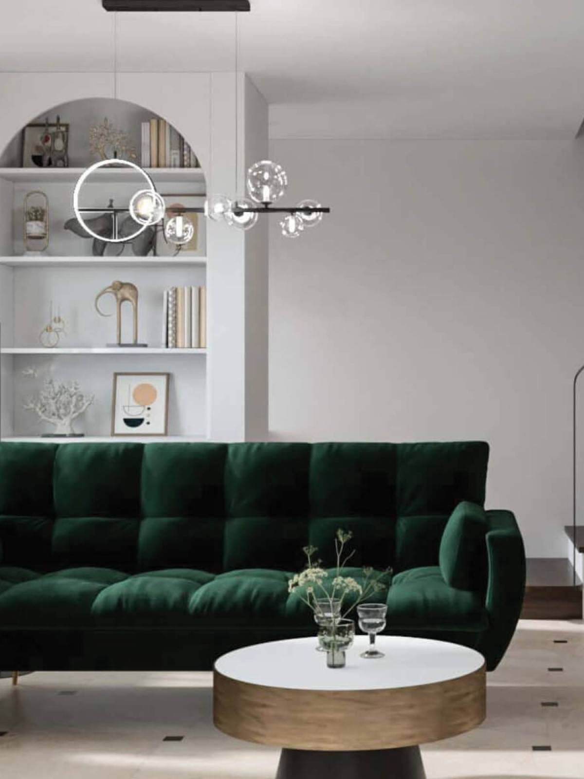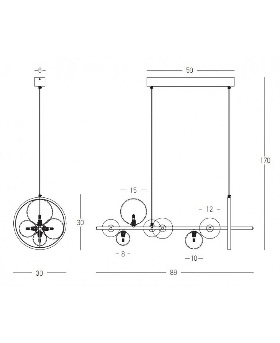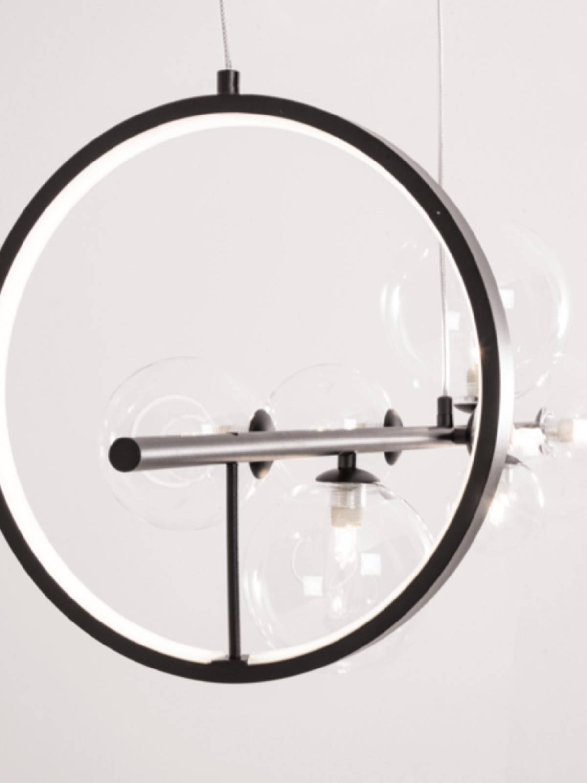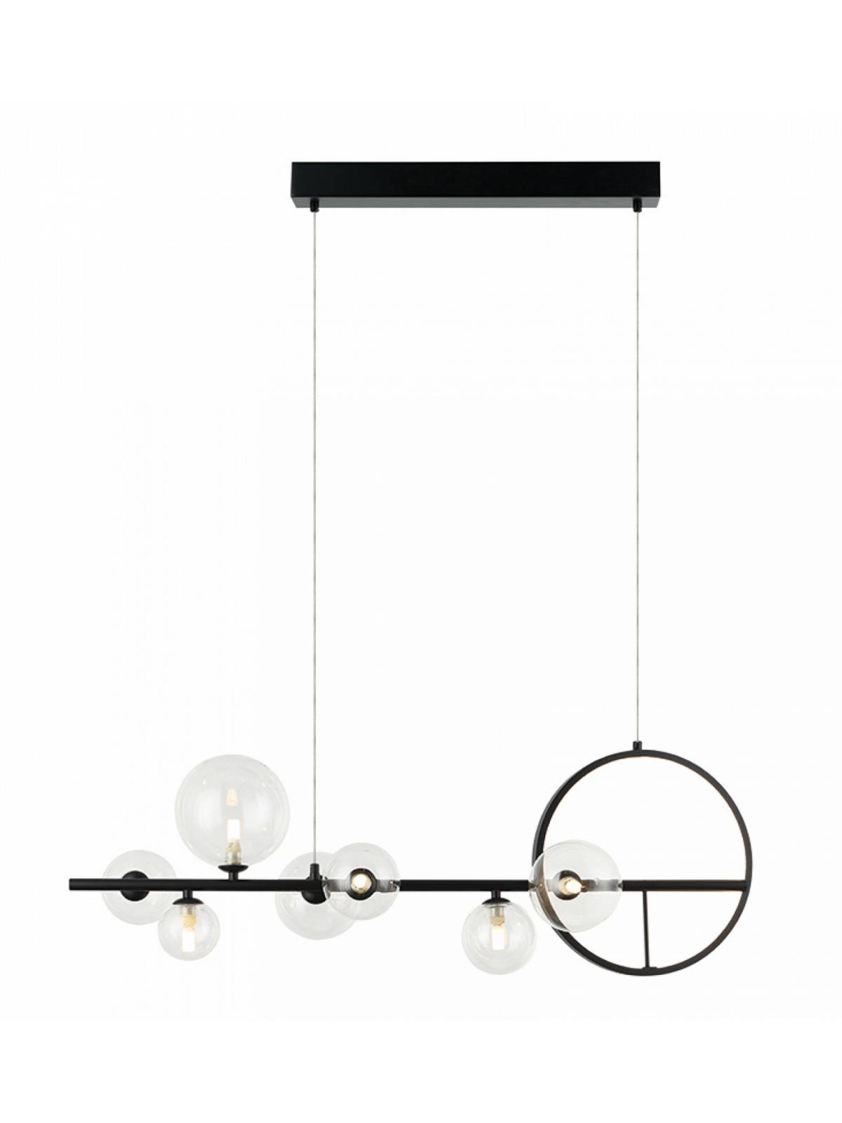 Konstrukcja opiera się na długiej, horyzontalnej linii, która staje się podstawą dla kulistych, szklanych kloszy w różnych rozmiarach. Transparentne szkło nadaje im lekkości, a zarazem wyeksponowuje źródła światła, które stają się integralnym elementem dekoracyjnym. Efekt wizualny dodatkowo potęguje umieszczony z jednej strony metalowy okrąg – minimalistyczny, ale wyrazisty detal, który przełamuje symetrię i dodaje całości dynamiki. To rozwiązanie sprawia, że lampa wyróżnia się spośród typowych modeli i nabiera charakteru nowoczesnej rzeźby świetlnej.