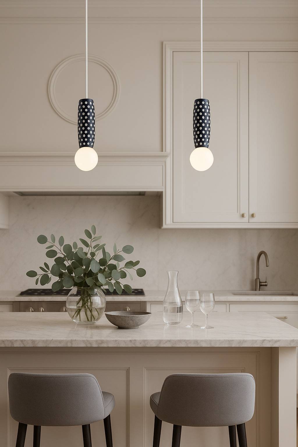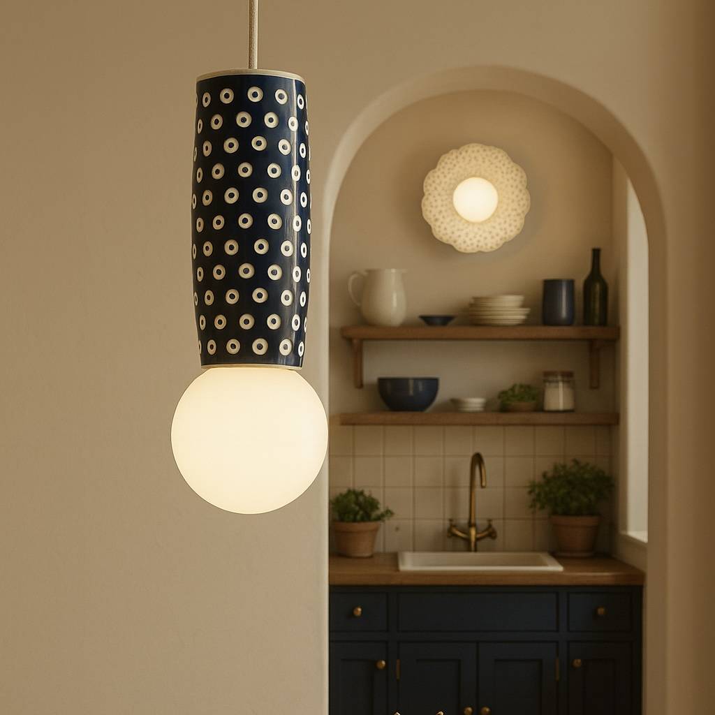 Lampa wisząca BOLL to wyjątkowa propozycja oświetleniowa, będąca efektem współpracy marki Argon z renomowaną Manufakturą Bolesławiec, w której nowoczesna forma spotyka się z wielowiekową tradycją polskiej ceramiki artystycznej. Model wyróżnia się smukłą, elegancką sylwetką oraz subtelnym zestawieniem kolorystycznym, opartym na charakterystycznym kobalcie przełamanym czystymi białymi zdobieniami, tak mocno kojarzonymi z ręcznie dekorowaną ceramiką z Bolesławca. Całość tworzy spójną i niezwykle estetyczną kompozycję, która przyciąga wzrok, a jednocześnie nie dominuje wnętrza. Centralnym elementem lampy jest ceramiczny klosz o wydłużonym, cylindrycznym kształcie, ozdobiony delikatnym, rytmicznym wzorem. Dekor stanowi subtelne nawiązanie do klasycznych motywów bolesławieckich, jednak w nowoczesnej, minimalistycznej interpretacji. Pod kloszem umieszczona została mlecznobiała kula, która pełni funkcję dyfuzora światła, zapewniając jego miękkie, przyjemne rozproszenie. Dzięki temu lampa emituje światło, które buduje ciepłą i komfortową atmosferę, idealną zarówno do codziennego użytkowania, jak i do tworzenia nastrojowego oświetlenia wieczornego. Prosta forma zawieszenia oraz jasna kolorystyka sprawiają, że lampa BOLL doskonale odnajduje się w wielu aranżacjach wnętrz. Świetnie komponuje się z przestrzeniami nowoczesnymi, skandynawskimi oraz japandi, a także z wnętrzami inspirowanymi stylem klasycznym czy artystycznym, gdzie liczy się detal i jakość wykonania. Może być z powodzeniem zastosowana jako pojedynczy punkt świetlny nad stołem, wyspą kuchenną lub stolikiem pomocniczym, a także w kompozycji kilku lamp zawieszonych w linii lub grupie, tworząc efektowną instalację świetlną. Lampa wisząca BOLL to nie tylko funkcjonalne źródło światła, ale również dekoracyjny element wyposażenia, który podkreśla indywidualny charakter wnętrza i zamiłowanie do rzemiosła najwyższej próby. Starannie dobrane materiały, precyzyjne wykonanie oraz ręcznie inspirowane zdobienia ceramiczne gwarantują trwałość i ponadczasową estetykę. Możliwość zastosowania standardowego źródła światła G9 pozwala na swobodne dopasowanie barwy i intensywności oświetlenia do własnych potrzeb, czyniąc lampę praktycznym i eleganckim wyborem do nowoczesnych, świadomie zaprojektowanych przestrzeni.