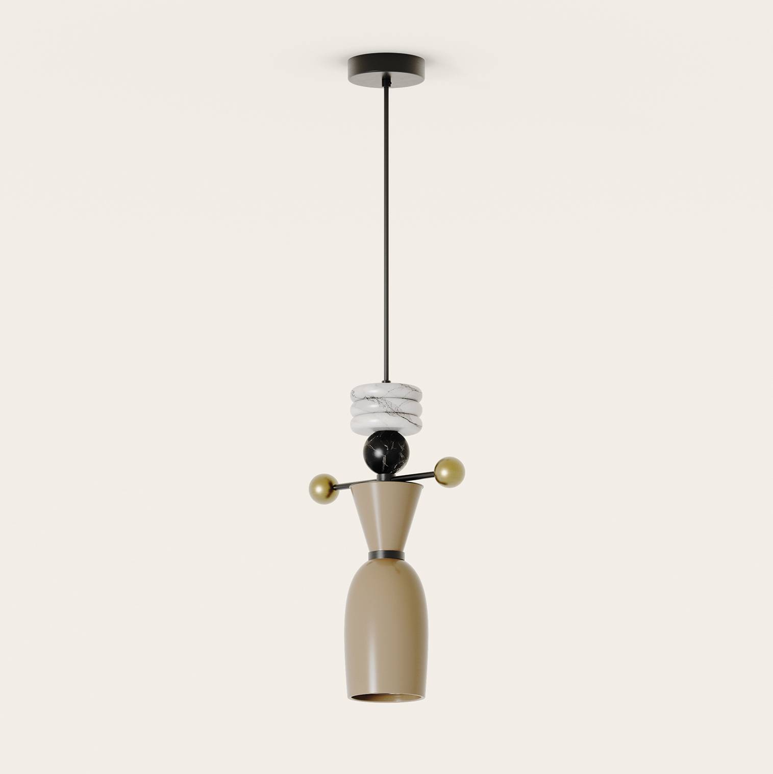 Lampa wisząca NURO marki Aromas to wyjątkowa oprawa oświetleniowa o wyraźnie rzeźbiarskim charakterze, która w niezwykle interesujący sposób łączy funkcję użytkową z dekoracyjną formą. Projekt tej lampy został oparty na kompozycji geometrycznych brył zestawionych w pionowej osi, dzięki czemu całość przypomina nowoczesną instalację artystyczną. To oświetlenie stworzone z myślą o wnętrzach, w których design odgrywa równie ważną rolę jak funkcjonalność. Centralna część lampy przyciąga uwagę wieloelementową konstrukcją, w której poszczególne formy płynnie przechodzą jedna w drugą. Dolny segment oprawy pełni funkcję klosza, którego zwężająca się ku górze sylwetka nadaje lampie dynamiczny i elegancki charakter. Taki kształt sprawia, że światło zostaje skierowane głównie w dół, tworząc przyjemną i skoncentrowaną strefę oświetleniową. Dzięki temu model ten doskonale sprawdza się nad stołem w jadalni, nad wyspą kuchenną lub jako pojedynczy akcent świetlny w salonie czy sypialni. Powyżej klosza znajduje się stożkowy element konstrukcyjny, który stanowi płynne przejście pomiędzy częścią świetlną a dekoracyjną częścią środkową lampy. Ten fragment konstrukcji wprowadza wyraźną geometrię do projektu i podkreśla jego nowoczesny charakter. Tuż nad nim umieszczony został poziomy detal zakończony symetrycznymi kulistymi elementami, które nadają lampie lekkości i oryginalności. Ten fragment projektu pełni funkcję estetycznego akcentu równoważącego pionową linię konstrukcji. Wyżej umieszczony element kulisty stanowi wizualny punkt centralny kompozycji. Jego obecność wprowadza do projektu miękką, organiczną formę kontrastującą z bardziej geometrycznymi częściami lampy. Bezpośrednio nad nim znajduje się dekoracyjny segment o wyraźnie rzeźbiarskim charakterze. Składa się on z kilku pierścieniowych form ułożonych jedna nad drugą, które nadają konstrukcji wyjątkowej głębi i strukturalnej dynamiki. Całość została zawieszona na smukłym przewodzie prowadzącym do minimalistycznego elementu montażowego przy suficie. Takie rozwiązanie sprawia, że konstrukcja lampy wydaje się lekka i elegancka, a cała uwaga skupia się na artystycznej kompozycji centralnej części oprawy. Regulowana długość zawieszenia pozwala dopasować wysokość lampy do charakteru pomieszczenia oraz indywidualnych potrzeb aranżacyjnych. NURO doskonale odnajduje się w przestrzeniach, w których liczy się wyrazisty design i oryginalne elementy wyposażenia. W nowoczesnych wnętrzach podkreśla ich architektoniczny charakter i minimalistyczną estetykę. W aranżacjach inspirowanych stylem modern lub eklektycznym staje się natomiast designerskim akcentem przyciągającym uwagę i nadającym przestrzeni indywidualny styl. Lampa ta świetnie sprawdza się jako pojedyncza oprawa dekoracyjna, ale równie efektownie prezentuje się w kompozycjach złożonych z kilku lamp zawieszonych na różnych wysokościach. Takie rozwiązanie pozwala stworzyć niezwykle efektowną instalację świetlną, która może stać się centralnym elementem aranżacji wnętrza. Projekt NURO jest doskonałym przykładem charakterystycznego stylu marki Aromas. Hiszpański producent znany jest z tworzenia oświetlenia, które łączy nowoczesne wzornictwo z wysoką jakością wykonania oraz wyjątkową dbałością o detale. W modelu NURO wyraźnie widać inspirację współczesną rzeźbą oraz geometryczną estetyką, która nadaje lampie niepowtarzalny charakter. Lampa wisząca NURO to propozycja dla osób poszukujących oświetlenia o silnej osobowości stylistycznej. Jej unikalna forma sprawia, że nie jest jedynie źródłem światła, lecz pełnoprawnym elementem dekoracyjnym wnętrza. Dzięki harmonijnemu zestawieniu geometrycznych brył, starannie zaprojektowanej konstrukcji oraz subtelnemu światłu model ten wprowadza do przestrzeni elegancję, nowoczesność i artystyczny wyraz.