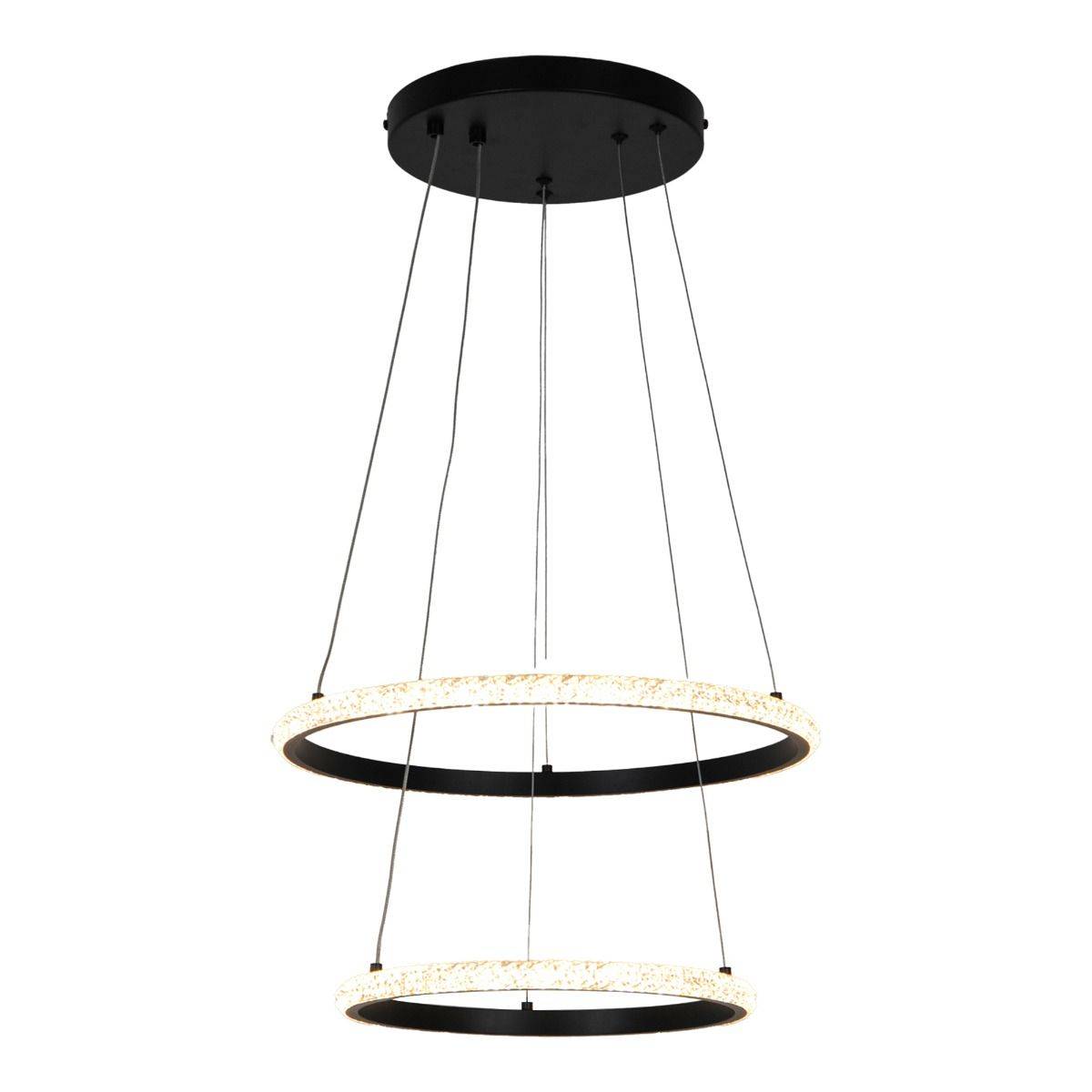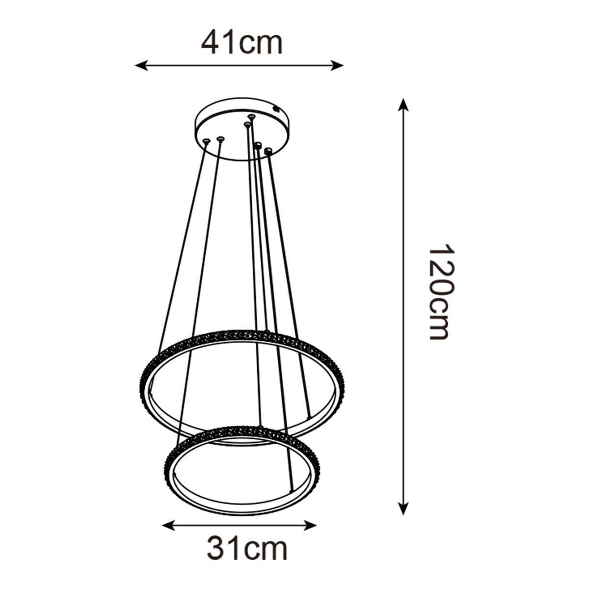 Podwójny układ pierścieni pozwala uzyskać równomierne oświetlenie w każdej części pomieszczenia, jednocześnie wprowadzając harmonię i wrażenie uporządkowanej symetrii. Dzięki regulowanej długości zawieszenia można ją dostosować zarówno do wysokich, reprezentacyjnych wnętrz, jak i niższych pomieszczeń, zachowując idealne proporcje.