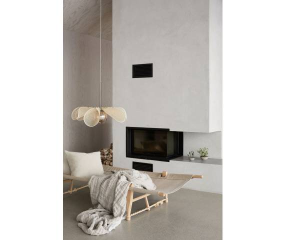 Najbardziej charakterystycznym elementem lampy STYRKA jest jej materiałowy klosz w formie nakładających się na siebie płatków.
