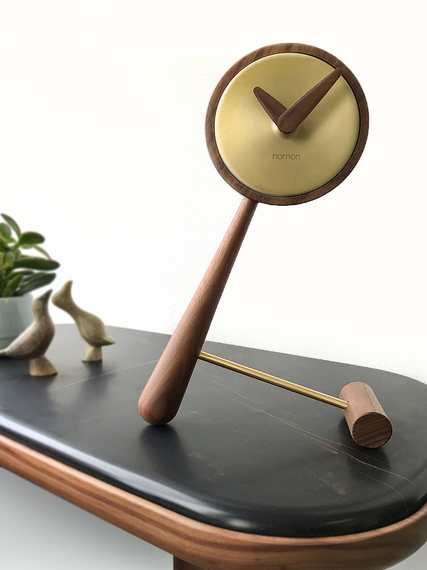 Zegar stołowy MINI PUNTERO G MPUNG w kolorze drewna orzechowego i mosiądzu NOMON