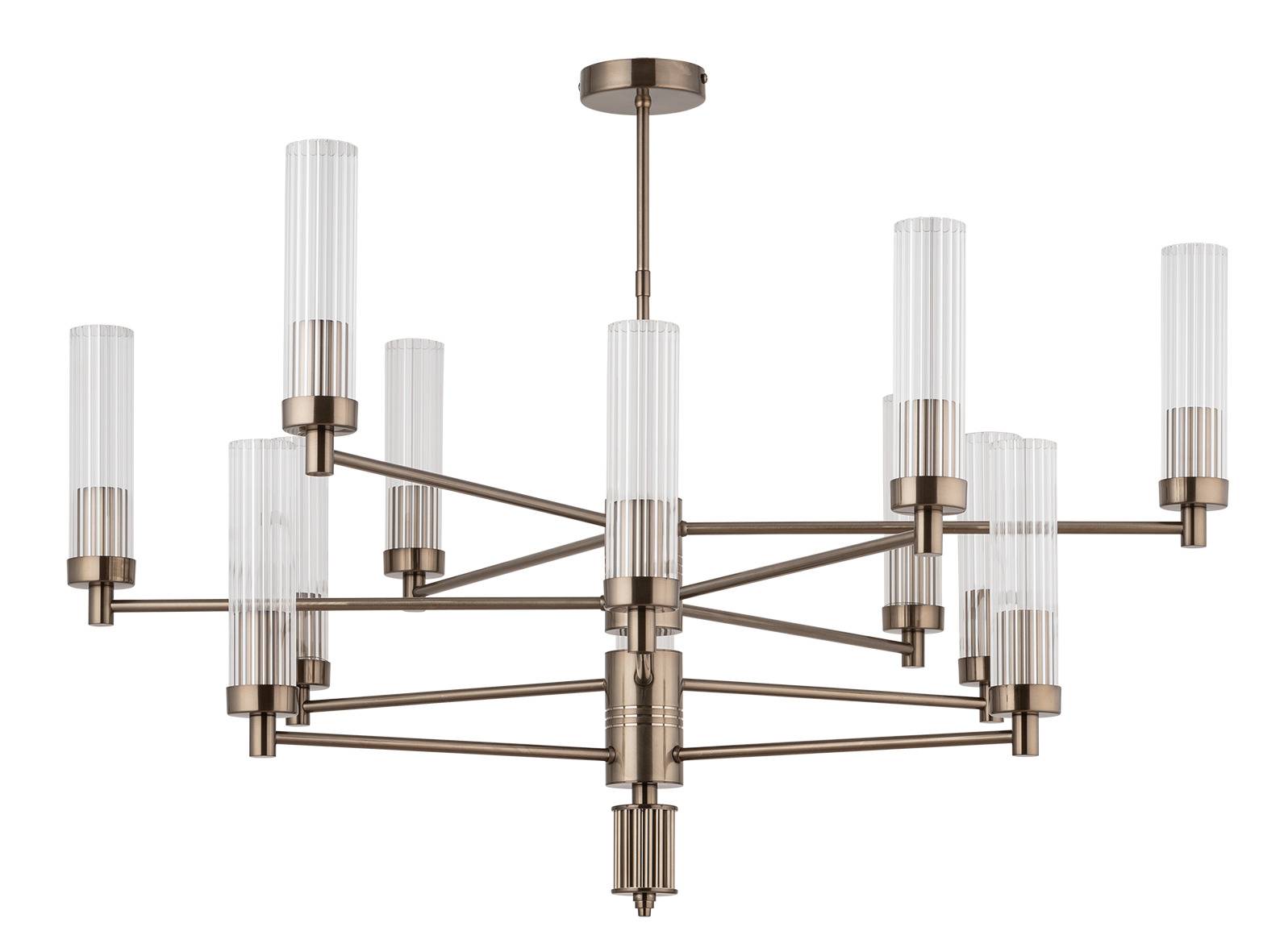 Konstrukcja żyrandola opiera się na dwunastu równomiernie rozmieszczonych ramionach, rozchodzących się wokół centralnego trzonu. Każde ramię zakończone jest smukłym, pionowym kloszem z ryflowanego szkła, które pięknie rozprasza światło i tworzy we wnętrzu subtelną grę refleksów. Klosze nadają całej konstrukcji wizualnej lekkości, mimo jej dużych rozmiarów, a jednocześnie podkreślają nowoczesny charakter kolekcji SETI.