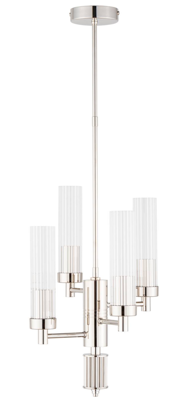 Konstrukcję żyrandola tworzy cztery ramiona rozmieszczone równomiernie wokół centralnego trzonu, zakończone smukłymi kloszami z ryflowanego szkła. To właśnie te szklane cylindry są znakiem rozpoznawczym kolekcji SETI – eleganckie, geometryczne i niezwykle efektowne. Dzięki pionowym żłobieniom, szkło pięknie rozprasza światło, tworząc subtelne refleksy i nadając wnętrzu głębi oraz wizualnego ciepła.